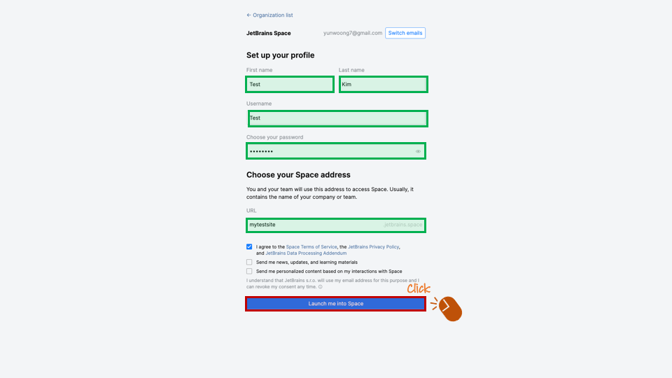 이름 (First name, Last name), Username, 비밀번호, URL을 입력 후 [ Launch me Into Space ] 를 클릭합니다. URL은 현재 존재하지 않는 주소여야 합니다.