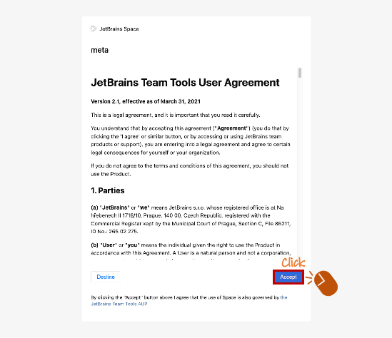 JetBrains Space로 이동하여 [ 무료로 시작하기 ] 를 클릭합니다.
