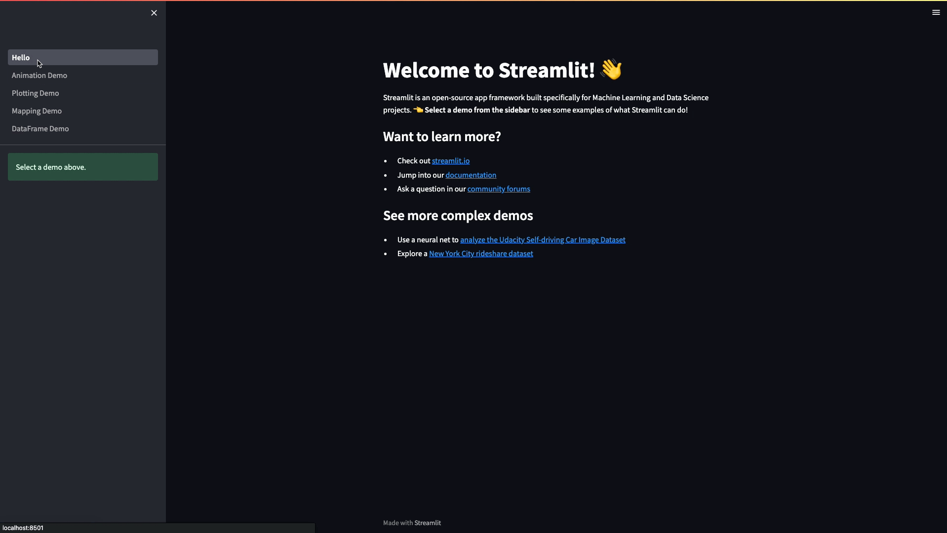 설치 후 터미널에 streamlit hello 를 입력했을 때 Streamlit Hello 앱이 열리면 모든 준비가 끝난 것입니다. 이 앱은 Streamlit으로 무엇을 할 수 있는지 많은 예제를 제공하고 있습니다.