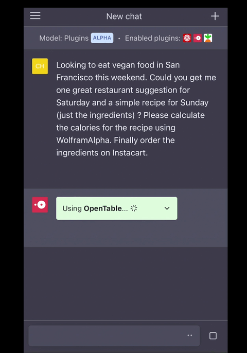 "이번 주말 샌프란시스코에서 비건 음식을찾고 있어.토요일을 위한 훌륭한 레스토랑 추천과 일요일을 위한 간단한 레시피(재료만)를추천해 줘.레시피의 칼로리는 울프람알파를 사용하여계산해 주고.마지막으로 인스타카트에서 재료를주문해 줘."라고 입력하면 식당 예약 서비스 오픈테이블에서 예약링크를 보여주고 재료를 추천한고 울프럼알파를 통해 열량을 계산한 뒤 보줍니다. 그리고 인스타카트에서 재료를 구매할 수 있도록 구매 Link를 보여주죠.