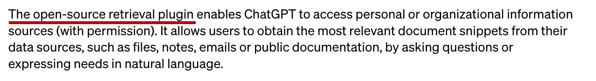 개인은 자신의 파일을 정리하거나 대량의 이메일에서 정보를 추출하려는 경우, 그리고 기업이 자신들의 knowledge 데이터를 바로 활용하여 손쉽게 생산성을 높이기 위해서 이 Plugin은 매우 혁신적일 것입니다. 그리고 Retrieval plugin은 오픈 소스로 제공하여 ChatGPT를 보강하려는 모든 개발자가 정보를 자체 호스팅할 수 있습니다.
