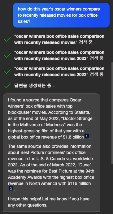 사실 이 기능은 Bing 채팅 모드를 사용해 보셨다면 매우 익숙하실 것 같은데요. ChatGPT는 검색 정보를 보여주고, 그 아래에 링크를 함께 제공하여 사용자가 클릭하여 바로 이동할 수 있게 합니다. 또한 참조한 출처도 표시합니다.