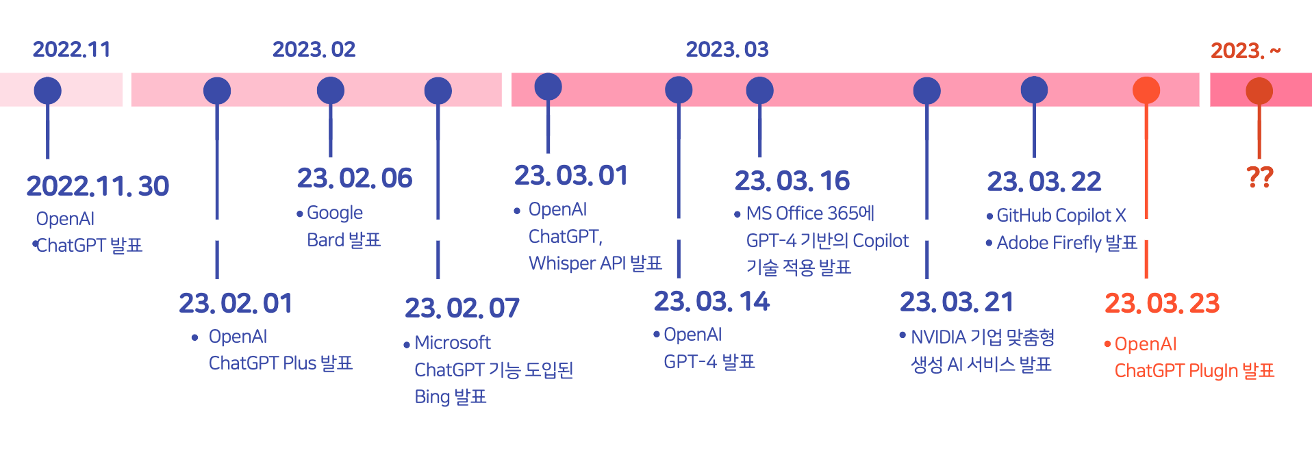 2022년 11월 30일 OpenAI가 ChatGPT 발표 후 최근 몇 달간 빅이벤트가 끊임없이 이어지고 있습니다. 이 현상은 AI의 발전과 인기를 보여주는 것이며, ChatGPT가 그 중심에서 선도적인 역할을 하고 있습니다. 그리고 현재 많은 기업들이 자신의 비즈니스에 ChatGPT를 활용하는 방안을 적극적으로 탐구하고 있습니다.