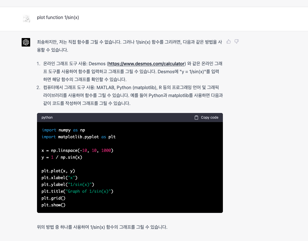 먼저 ChatGPT-4 버전에서 plot function 1/sin(x)라고 입력해보겠습니다. 그래프를 그릴 수 있는 Tool을 소개하거나 Python Code로 만들어 줍니다.