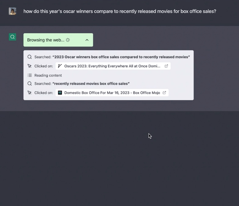 ChatGPT에 항상 제기되는 문제는 제한된 학습 데이터 세트입니다. 최근 데이터는 답변에 포함되기 어렵습니다. 하지만 이제 Browsing Plugin을 활성화하면 ChatGPT는 Plugin을 호출할지 아니면 자체적인 지식을 사용하여 사용자의 질문을 처리할지 결정할 수 있습니다. 이를 통해 최신 정보에 더 쉽게 접근할 수 있게 되었죠.