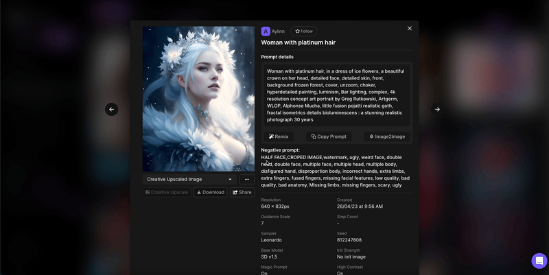 그림을 클릭하시면 이미지 생성에 사용된 모델, Prompt, 그 외 세부 정보를 확인할 수 있고 다운로드, 공유가 가능합니다.