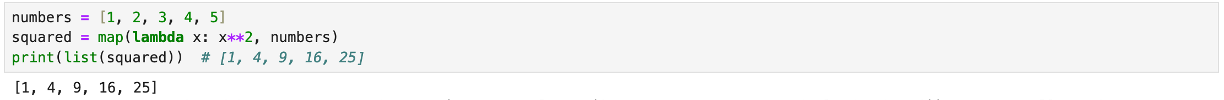 print(list(squared)) # [1, 4, 9, 16, 25]