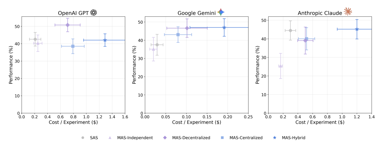 각 LLM은 각각 잘 맞는 아키텍처가 달랐습니다. OpenAI는 Hybrid에서 강한 시너지를 보였고, Google은 어떤 아키텍처를 써도 성능 차이가 5% 미만으로 안정적이었습니다. Anthropic은 Centralized에서 가장 일관된 성능을 보였습니다. 즉, 어떤 모델을 쓰느냐에 따라 최적의 아키텍처도 달라질 수 있습니다.