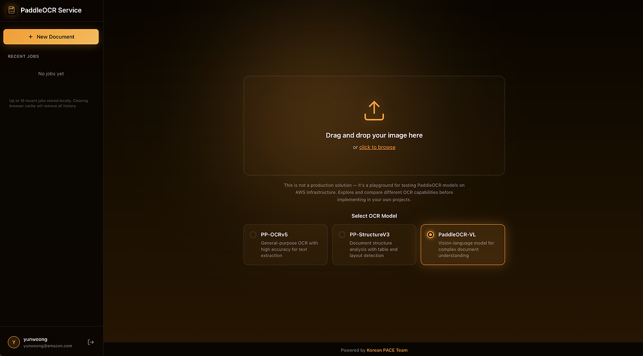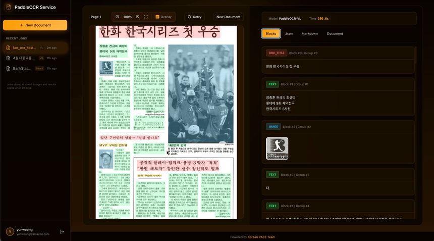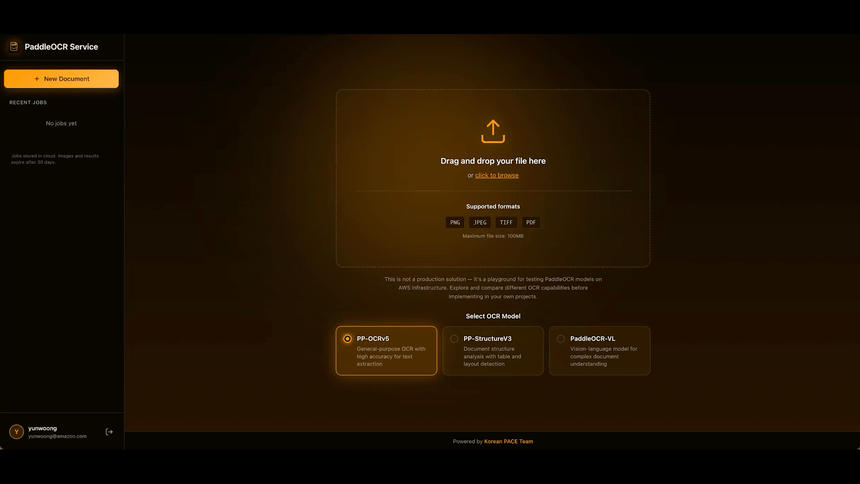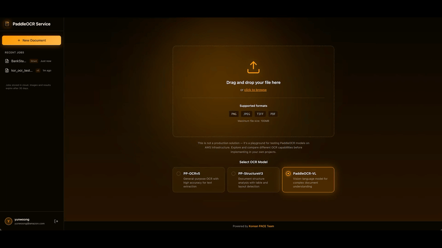 PaddleOCR Service는 PaddleOCR 모델들을 AWS 서버리스 인프라에서 테스트할 수 있는 웹 기반 플레이그라운드입니다. 이미지나 PDF를 업로드하면 OCR 결과를 바로 확인할 수 있고, 바운딩 박스 오버레이로 인식 영역도 시각적으로 볼 수 있습니다.