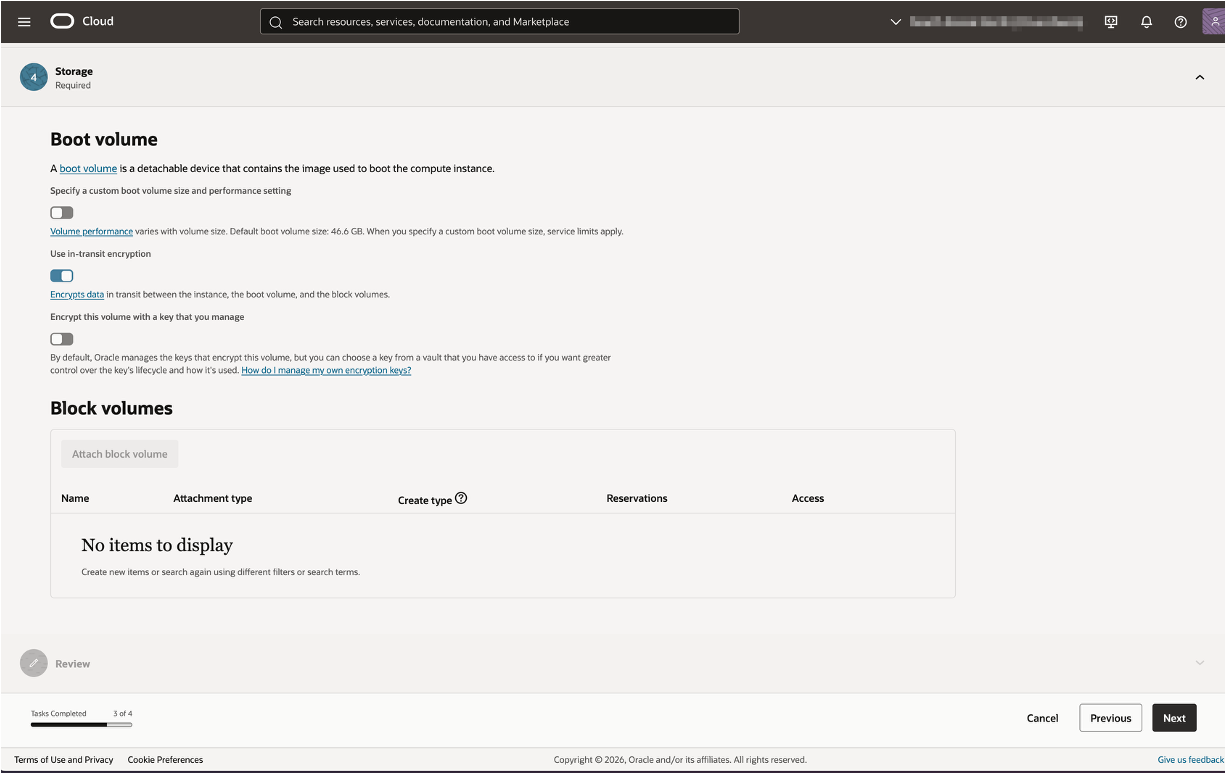 Storage도 기본값으로 두면 됩니다. 기본 부트 볼륨이 47GB로 설정되어 있고, 상시 무료로 총 200GB까지 사용 가능해요. 필요하면 나중에 부트 볼륨 크기를 늘리거나 블록 볼륨을 추가로 붙일 수 있습니다.