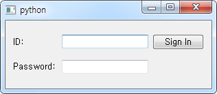 import sys from PyQt5.QtWidgets import * class MyWindow(QWidget): def __init__(self): super().__init__() self.setupUI() def setupUI(self): self.setGeometry(800, 200, 300, 100) self.label1 = QLabel("ID: ") self.label2 = QLabel("Password: ") self.lineEdit1 = QLineEdit() self.lineEdit2 = QLineEdit() self.pushButton1= QPushButton("Sign In") layout = QGridLayout() layout.addWidget(self.label1, 0, 0) layout.addWidget(self.lineEdit1, 0, 1) layout.addWidget(self.pushButton1, 0, 2) layout.addWidget(self.label2, 1, 0) layout.addWidget(self.lineEdit2, 1, 1) self.setLayout(layout) if __name__ == "__main__": app = QApplication(sys.argv) mywindow = MyWindow() mywindow.show() app.exec_()